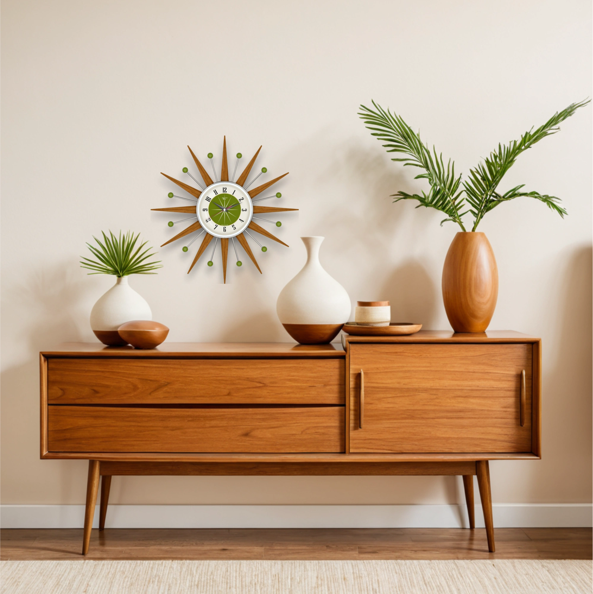 - Wood: Many mid-century clocks feature wood, especially teak or walnut, either in the clock body or the radiating spokes of a starburst. Wood instantly adds warmth and a touch of nature. If you have a lot of wood furniture, a clock with matching wood tones will create a harmonious look. For instance, a starburst clock with rich teak rays and a brass center captures that vintage vibe perfectly – it's both elegant and inviting.